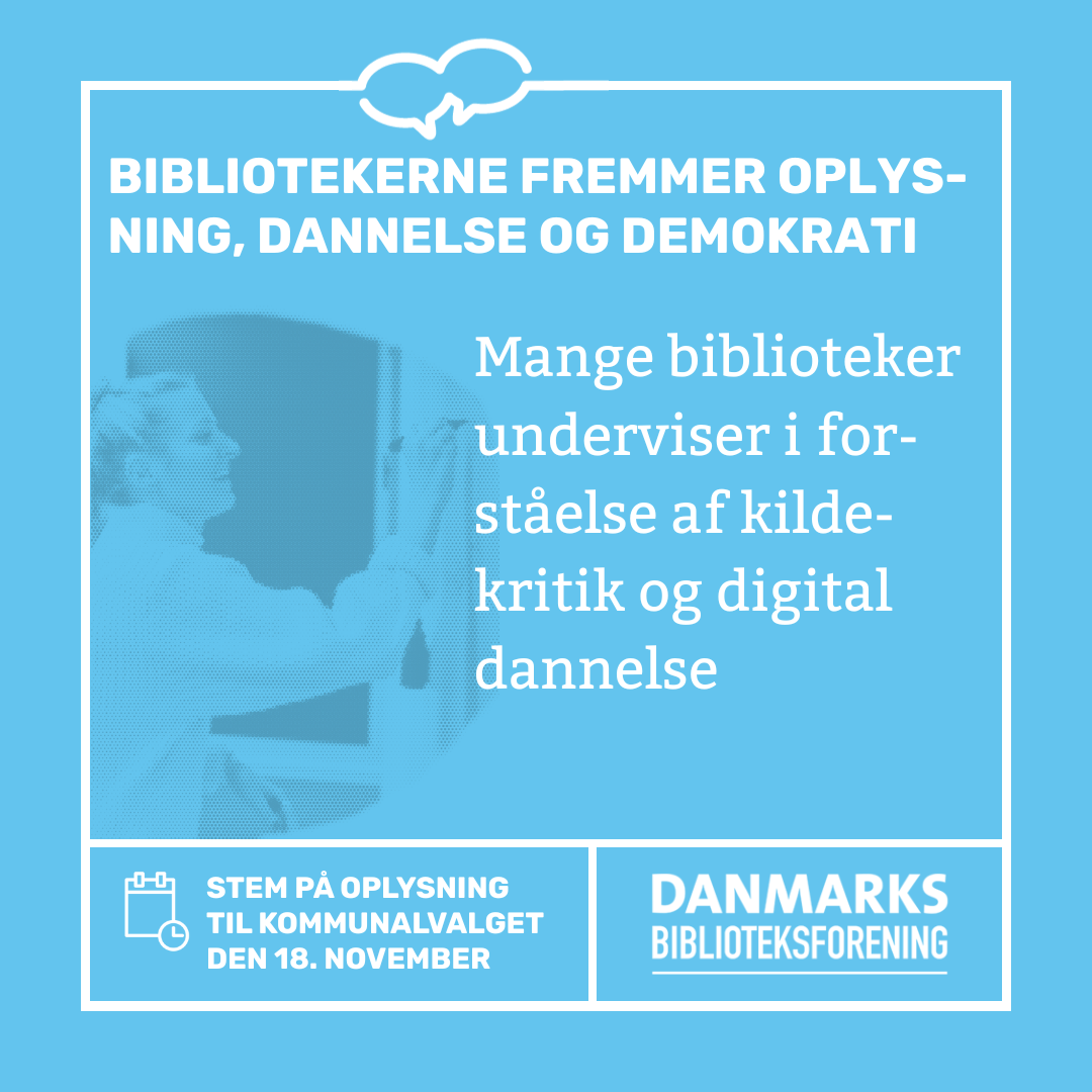 På bibliotekerne er der mange steder undervisningsforløb hvor forståelse af kildekritik er i højsædet, ligesom bibliotekerne engagerer sig aktivt ind i den digitale dannelse af vores børn og unge. Dette sker bl.a. via fakenewslab som stiller ressourcer frit til rådighed for lærere, undervisere, bibliotekarer og andre, så de kan klæde unge mennesker bedst muligt på til at begå sig i deres digitale samtid.